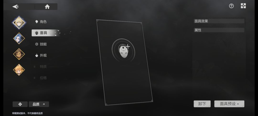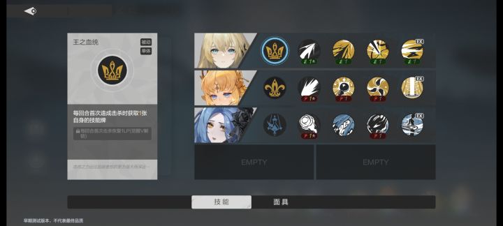 战斗场景,机制和人物建模。现在看还行,不是q版的战斗建模。技能是抽取的,不能固定所以一个人物有好几个技能,有属性技和普通技能。破盾机制,打破敌人无法动弹。有面具这种强化。