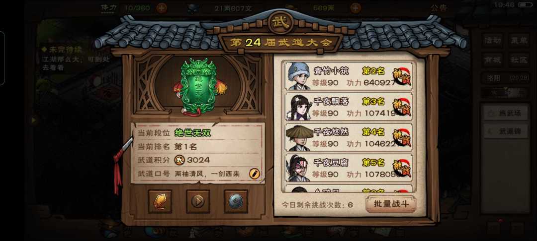 3:60级开始换上乘武学,巨鲸帮轻功不要换,先换内功叠浪决给输出,然后做八卦门任务拿八卦刀法,然后拿元引归心诀,泉州酒铺的百花枪决,还有三阴催心功,都可以拿,打血衣楼还有种玉决和血衣剑法。碎虚指和归元剑意,去Wiki一搜就有获得方法 70-80,42万战力开始做铁刃门,46万应该就能打通铁刃门,龙象波若功镇派内可以学,无暇棍法任务可以开始做了。还有烈阳神掌和离火诀,80级做乾元功任务 然后就是阵容问题 不氪金的话 陶渊溢当主坦,柳如意学拳,六扇门钟无月学刀, 氪金的话 女号推荐一定买个老僧学棍,因为你前排很脆,前中期没有铁布衫和千斤坠两个少林秘技,然后就是商和薛龙城,(买基金的第一个随从推荐薛龙城,为了先涨好感度早做二阶任务氪佬当我没说) 然后就是六扇门和拘魂阁的问题 简单介绍一下:拘魂阁镇派武学是幻影剑,秘技是兵器:加连击率,化血术:10%吸血 六扇门镇派武学是绣春刀,秘技是柳絮:10%穿甲5%攻击,还有笼斗术:6%防御和反伤 我的建议是:想养剑随的可以去拘魂阁,想玩刀的去六扇门。现在六个门强一点。 愿你历尽千帆,心明不变