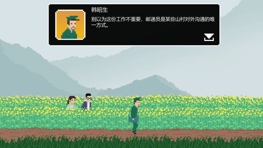 在老韩的想象中,小路两旁的泥土湿软蓬松,绵延的油菜花从他的身后掠过,连绵的山脉缓缓消失在远方。他身穿墨绿的邮递员服,怀里揣着墨绿的邮包。