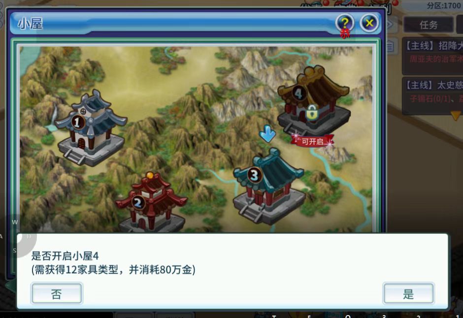 (装潢图鉴分数是图鉴评分。这个摆放武将的装潢分数,是摆放家具的分数,需要把家具摆放出来。比如摆放在1号房1层,1号房1层的分数达标后,就可以摆放武将。4个小屋,一共8层。想都达标,就需要大量家具)