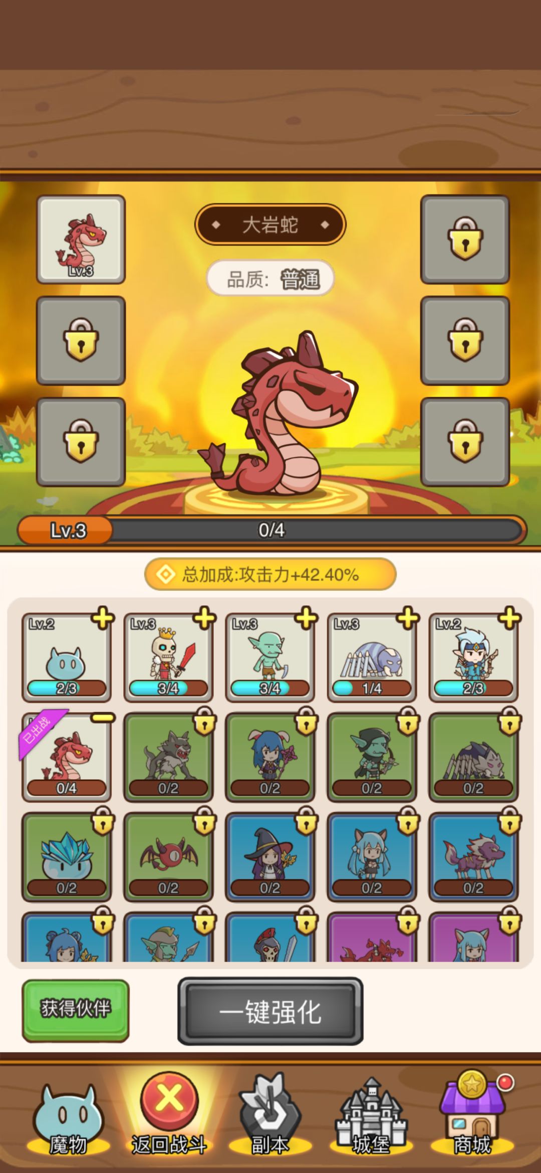 关卡“普通1-5”通过后将会开启商城,我们可以在商城中召唤装备,通过多次召唤可以提升召唤池的等级,更高的召唤池等级可以拥有更高的概率获得高品质装备哦。商城中还拥有技能和伙伴的召唤,每一项新的能力都可以给我们带来质的变化,我们需要通过完成主线任务和关卡进行解锁,游戏中将会自行比较玩家现有装备对玩家带来的增益数值,增益更高的装备将会有红点提示玩家进行换装哦~前期推荐主推攻击力快速过关和完成主线,解锁小怪兽的不同能力获得迅速提升!