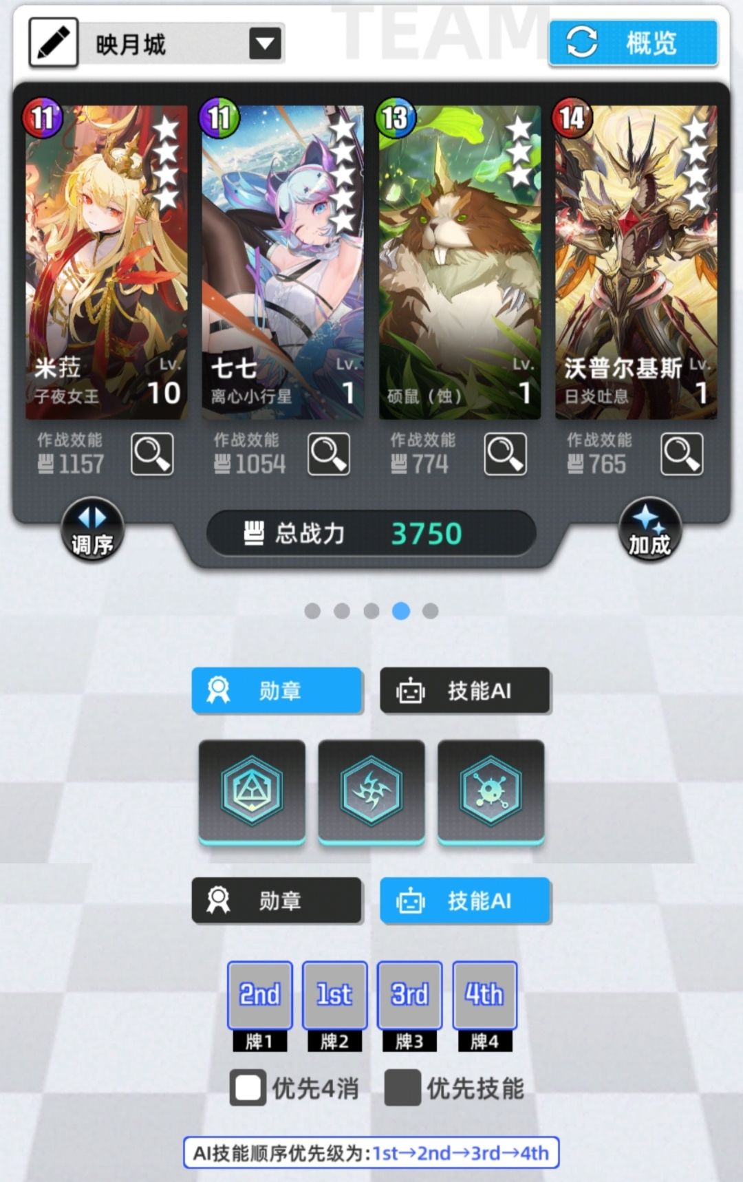 角色【猩红之锋*芙里娅】升到满级最好,【闪耀时刻*桃子】【金运收获者*金格】可以选择升级除了四消及以上情况外,优先消除火、光属性宝石给【猩红之锋*芙里娅】充能,最多释放两次技能即宣告游戏胜利,其他三个角色均为给其充能而存在,【闪耀时刻*桃子】【金运收获者*金格】为绑定组合,替换其中一个则另一个也需替换。