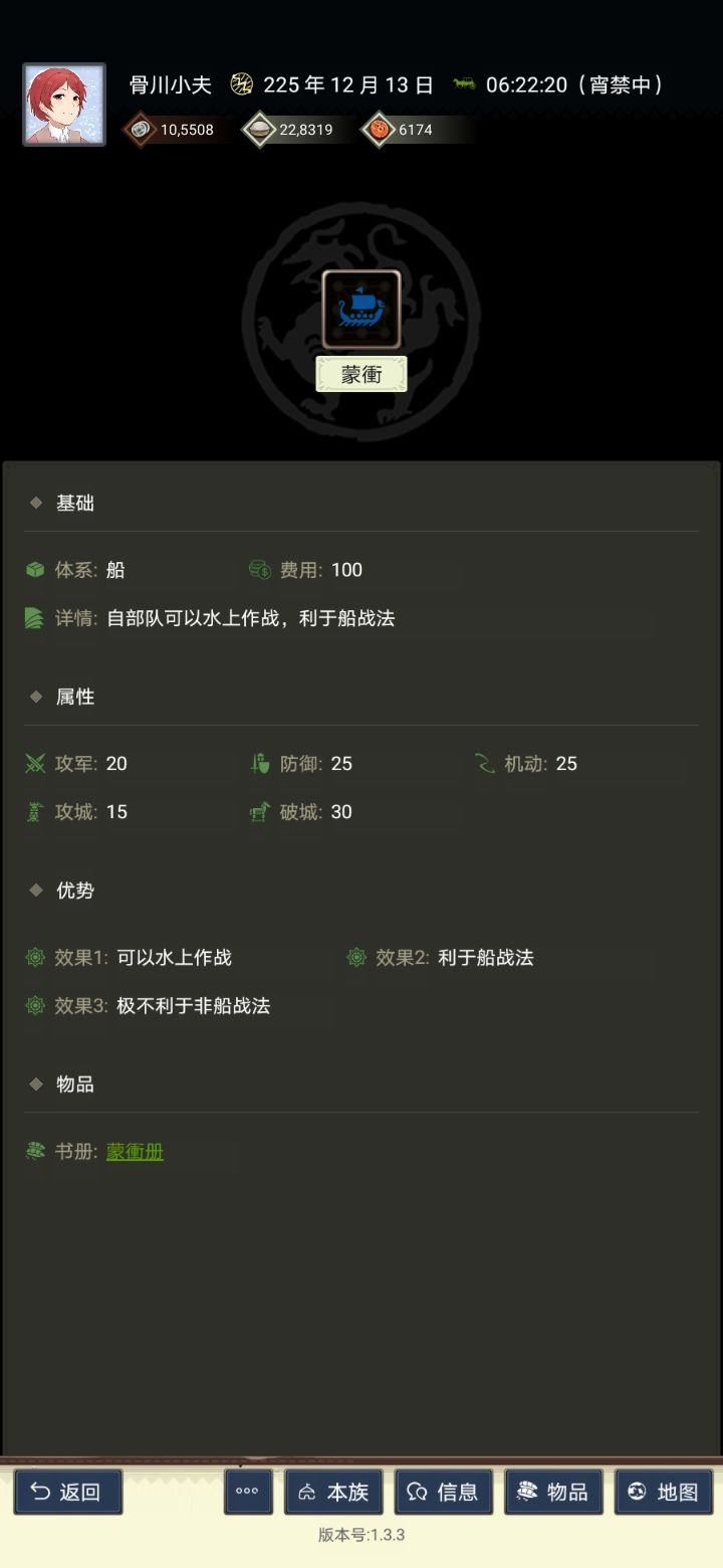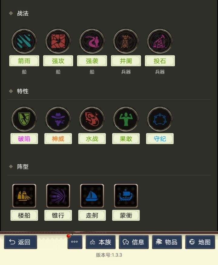 3.船科技,船只分为小(走舸)中(蒙冲)大(楼船)三种,默认是小船,速度快,攻防极低,而战争科技里面,可以解锁中大船,速度较慢,但是攻防大幅提高,可以分情况选择,做出针对性的部署。