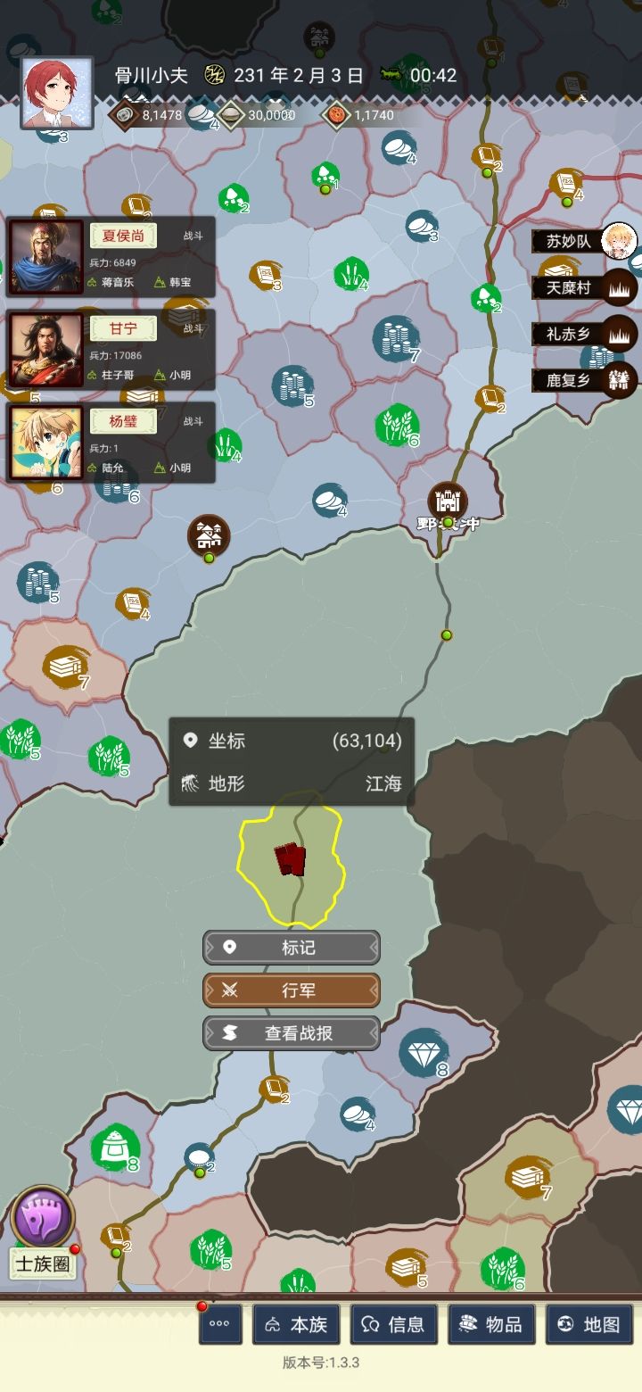 2.立族。与山贼流一致,优先继承兵多壮丁多的士族,此外,尽量选择周围有河流的地方,河流越多越好。