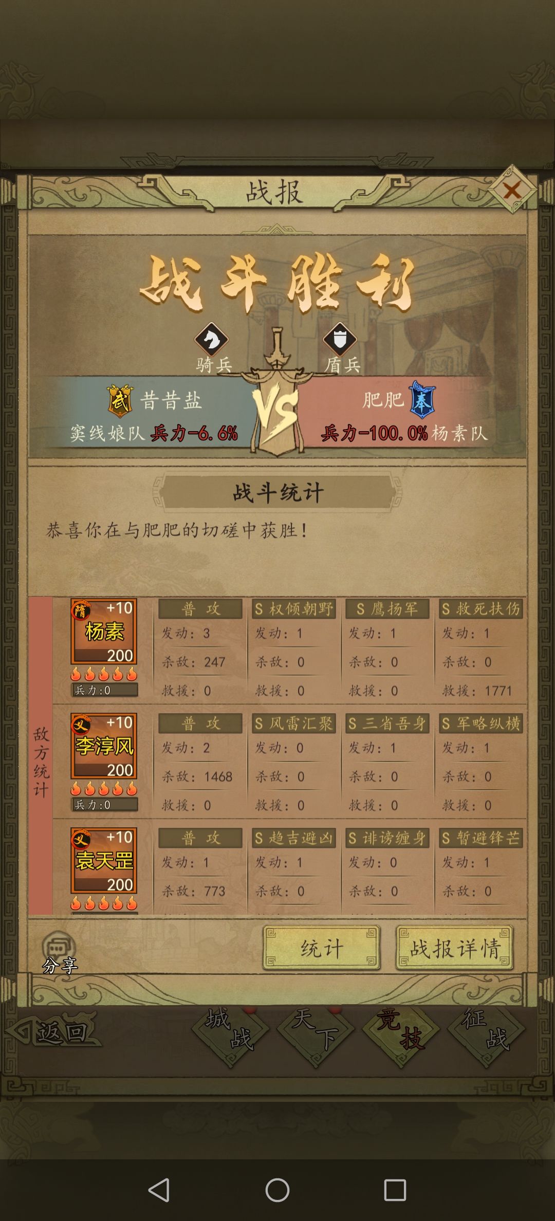 这里是我运气比较好,但是我的义骑打他的素三鲜确实是有一定胜算的,而且就算我输了他的战损也不低