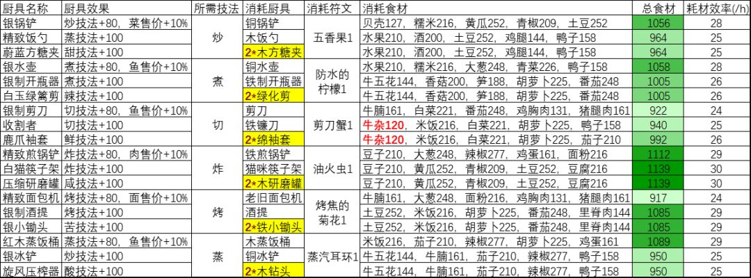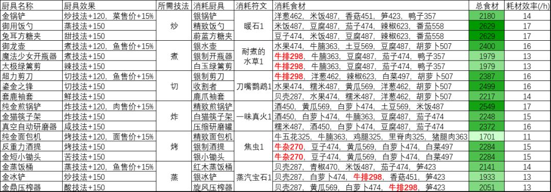 然后列一下新版实验室厨具研发所需的详细食材消耗,总食材消耗越多颜色越深,牛排和牛杂因为探索获得很少所以被标红,其他的如果不疯狂做庙钟刷钱而且金币自由之后有去新手池买菜的习惯的话基本不会缺。