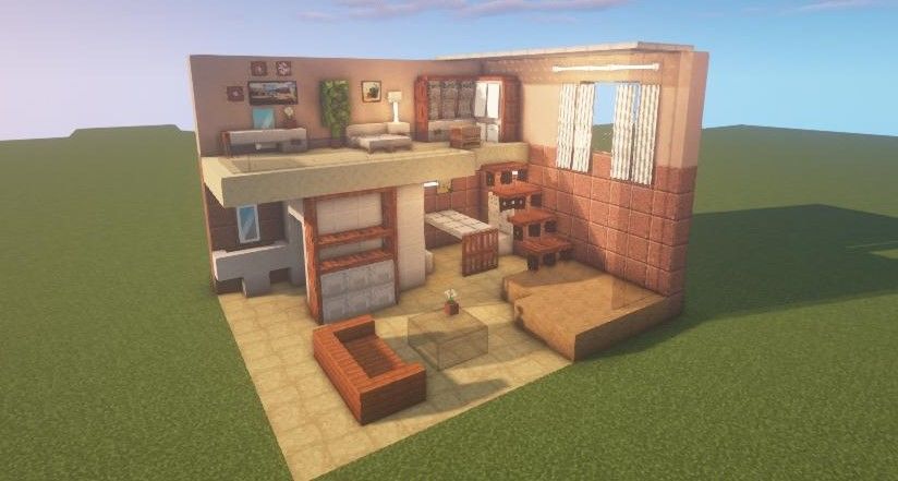 在地面右侧用去皮丛林木搭出一个平台,用金合欢木活板门和深色橡木栅栏门做出楼梯~