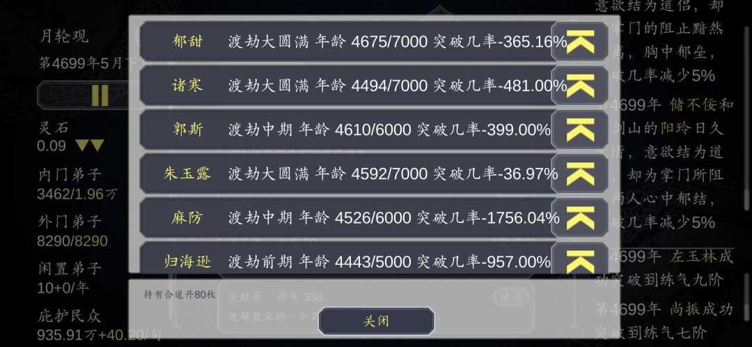 9.死了的家伙可以重生的,但我没搞懂咋回事。重生概率特小我小几千人的宗门也就看到三四个活过来的。重生的buff是自身不会意外死亡且亲友要死的时候有概率被他救