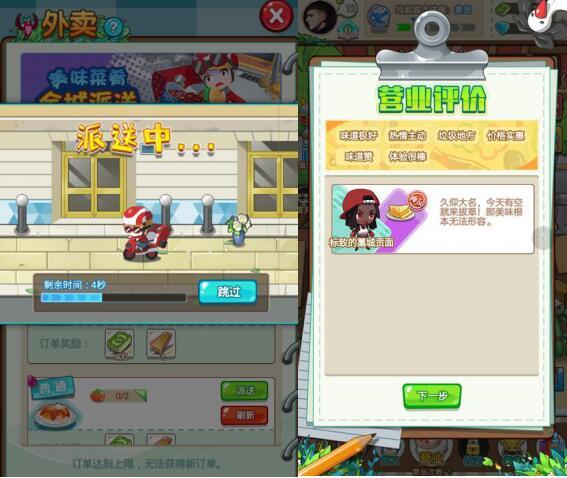 客人用餐完之后还会进行用餐点评,评价的好坏也牵扯着每位玩家的喜怒哀乐,只能更努力的收集菜谱提高厨艺。此外,还有外卖玩法,玩家可以自由接收外卖订单,体验外卖小哥送餐的辛苦,是不是跟现实生活中一模一样呢?