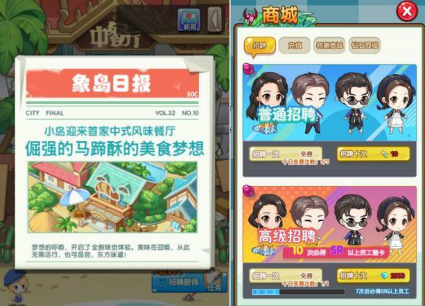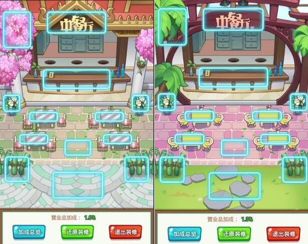 【自由DIY,店铺装修】俗话说“人靠衣装马靠鞍”,好看的外表总是能吸引到更多的关注,经营餐厅同样也要注重装修的。经过一系列的宣传推广,中餐厅的客人越来越多,是时候进行扩建和装修了,大到餐椅吧台门楣,小到花草树木,玩家都可以凭借自己的喜好来进行DIY设计,还可以招募更多明星小伙伴的加入,规模越大收益自然也会越多。