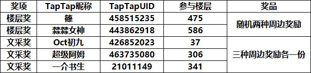 4:本次活动将使用TapTap论坛抽奖工具开奖,请大家关注后续开奖贴并填写收件信息,若不及时参与或评论内容不符合要求则无法正常获奖,中奖名单及特殊奖项领奖事宜请关注后续开奖贴