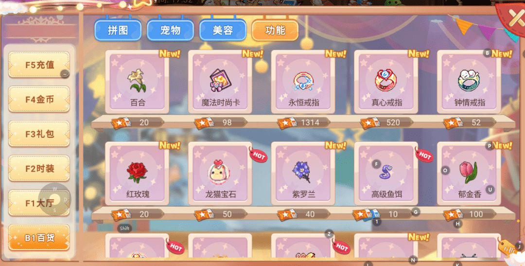 当玩家之间建立了情侣关系,那么进一步玩法当然是增加亲密度啦,玩家可以通过商城-百货-功能,进行购买花和戒指等增加亲密度。目前商城戒指一共有3种:永恒戒指、真心戒指、钟情戒指。