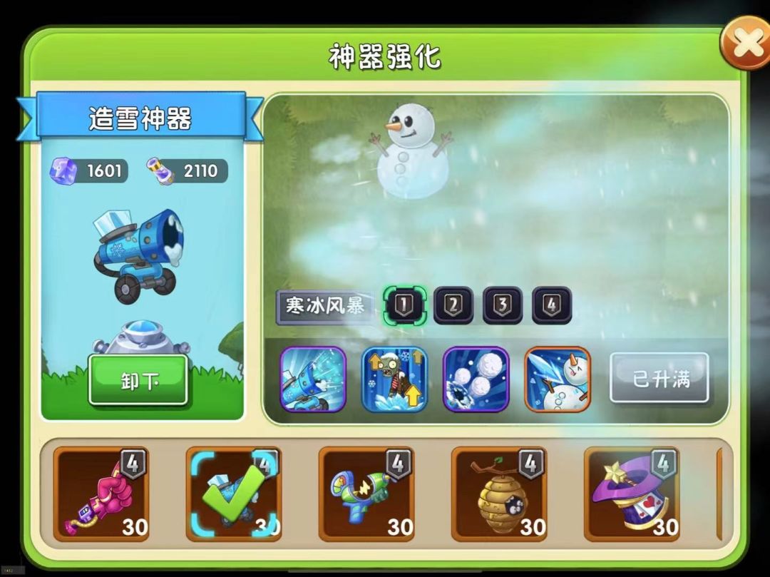 随着神器等级的提升,吹雪的持续时间将会增长,吹雪效果结束后场上的雪人和冻结的僵尸仍将短暂持续当前状态。