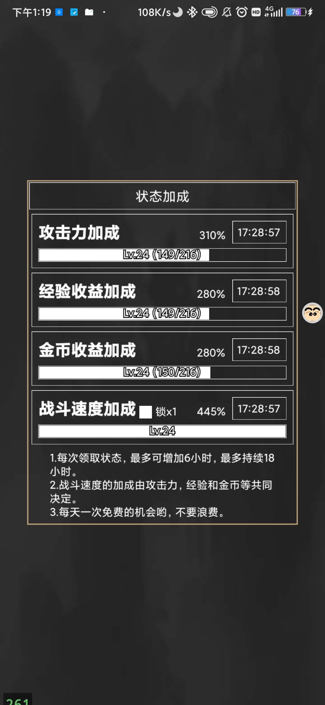 ①从3月3号开服开始玩,很早开始用云手机或模拟器挂在线战斗,至今实际离线时长不超过2天;