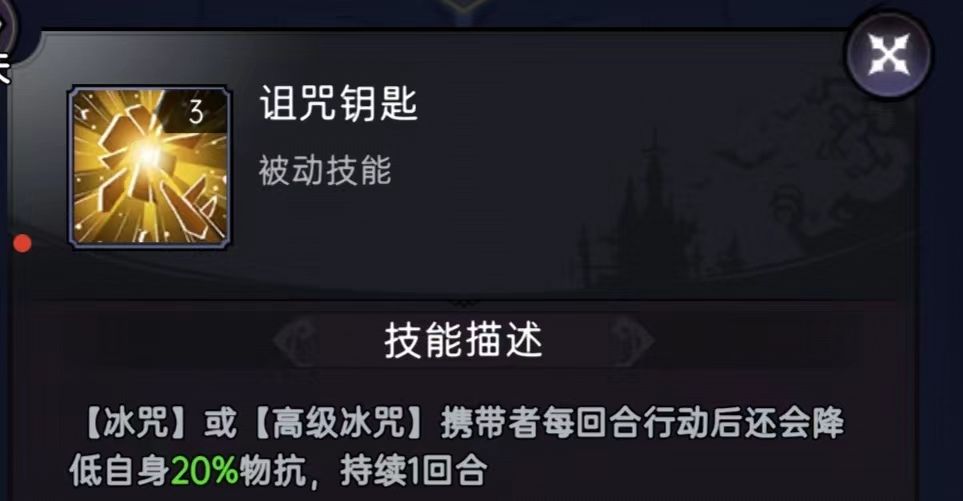 胡子男爵与侠盗小吉的配合还不止于此。从胡子男爵是可以给对方施加冰封状态的,这样一来又提升了侠盗小吉的输出。此外,从整体来看,胡子男爵受击施加冰封状态,以及觉醒的的技能:对面行动后降低物抗。都表明这个队伍是不需要高速。这样一来,该队伍也就不必抢速度。
