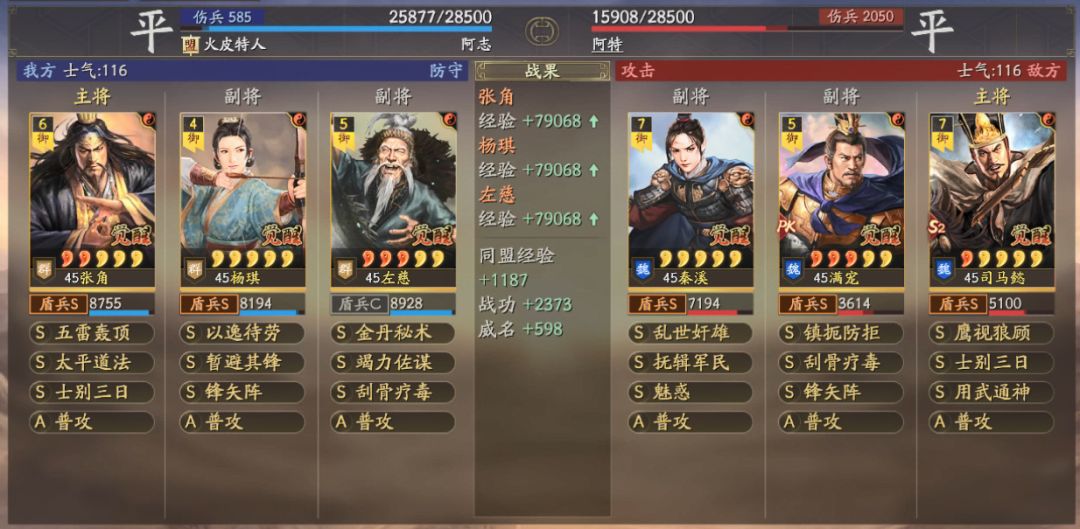 示例:面对阿志的杨琪(庞统)、张角、沮授组成的强力输出阵容,我选择用杨琪(曹操)、满宠、司马懿组成魅惑太尉盾,兵种克制+2保1,哪怕打平也是我方低兵损。