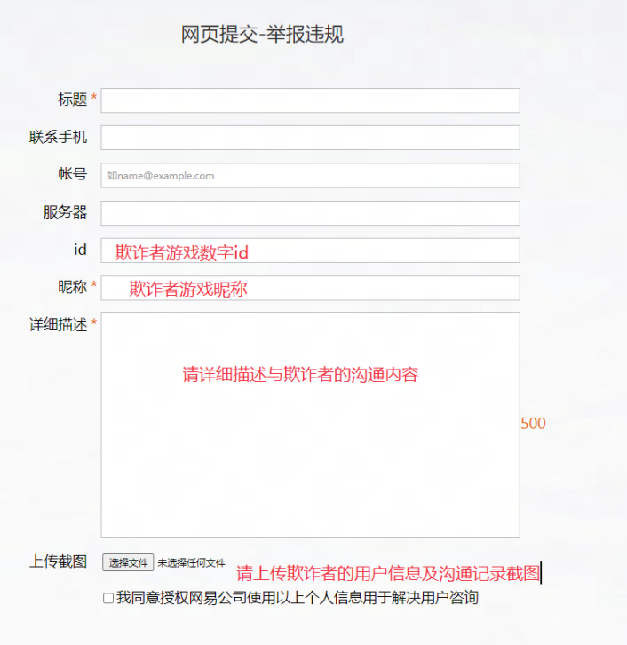 欺诈者游戏数字id、无遮挡无剪裁游戏内双方沟通截图、无遮挡无剪裁游戏外双方沟通截图、欺诈行为(单方赠礼、账号被盗、拉黑等)截图、无遮挡无剪裁游戏外欺诈者账号信息截图,示例如下