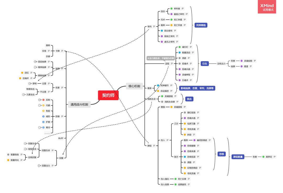 从契约师的独有卡牌归纳了契约师的核心机制,并与一般的战斗机制做了交叉连线,以展现两者交互、契约师如何实现对敌、防御与回复,体现契约师职业简单的设计思路