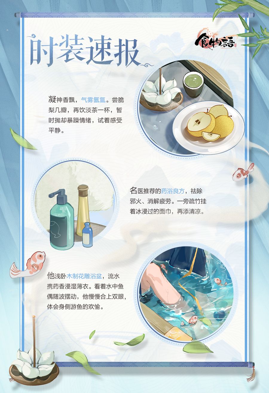 他浅卧木制花雕浴盆,流水携药香浸湿薄衣。看着水中鱼偶随波摆动,他慢慢合上双眼,体会身侧游鱼的欢愉。