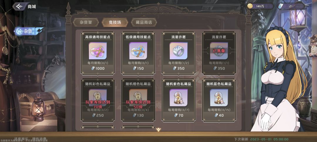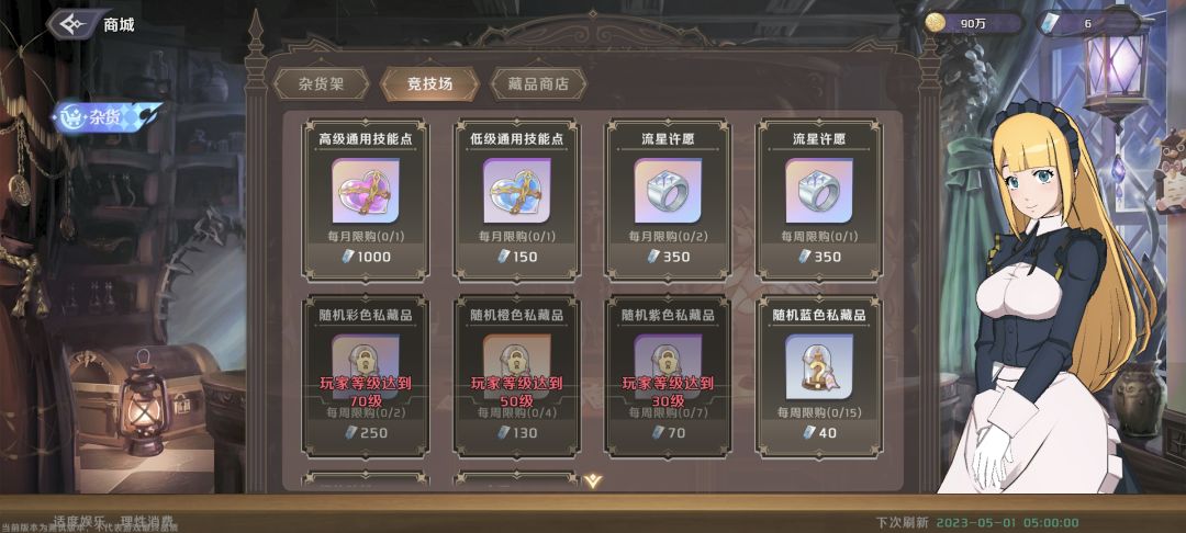 竞技场每月能换一个高级通用技能点(SSR用)和一个低级通用技能点(R和SR用),技能点角色每升5级给一个。