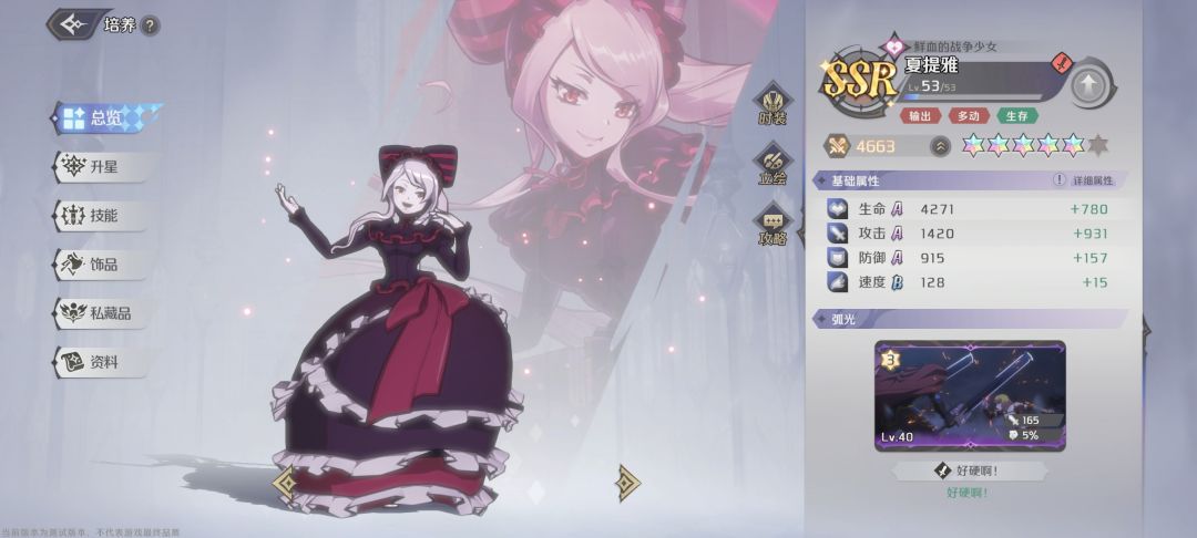 剧情送的群体输出SR雅儿贝德在后续剧情会提升成SSR(升3星自动变SSR,娜贝应该也是,不过技能没变化,雅儿贝德在游戏中会送碎片和专属技能点,所以养成不会太难),所以应该可能也许还是可以养的?不过当时不知道,所以我在up池选了SSR依比鲁艾(平a命中前自身加攻,被动暴击属性100%转化攻击力,有两个以上增益状态加伤,2回合CD的单体攻击,但会弹射,弹三次,命中重复目标伤害减半,3回合大招命中血大于80%的目标加伤)。