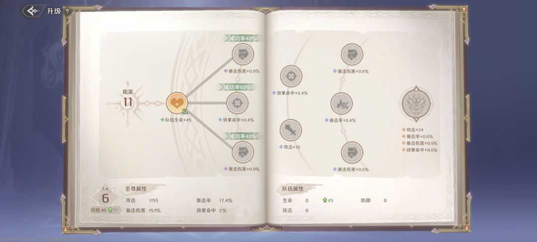 行动前,随机1名队友获得【攻击提升】,【防御提升】,【效果命中提升】,【效果抵抗提升】,【暴击提升】,【暴击伤害提升】其中一项,持续2回合