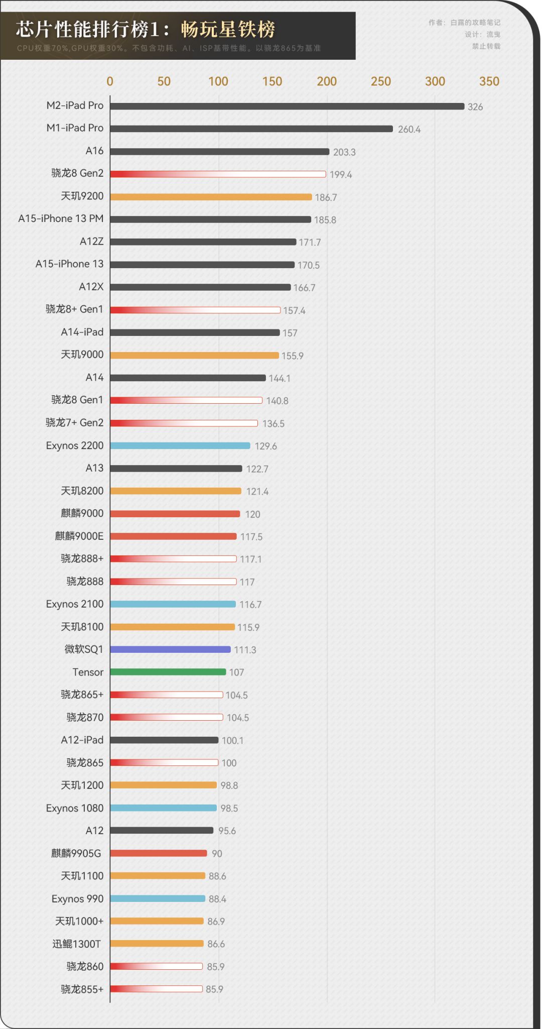 安卓手机端芯片类型复杂,为了更好的说明我们以极客湾制作的天梯图为材料给大家进行说明。