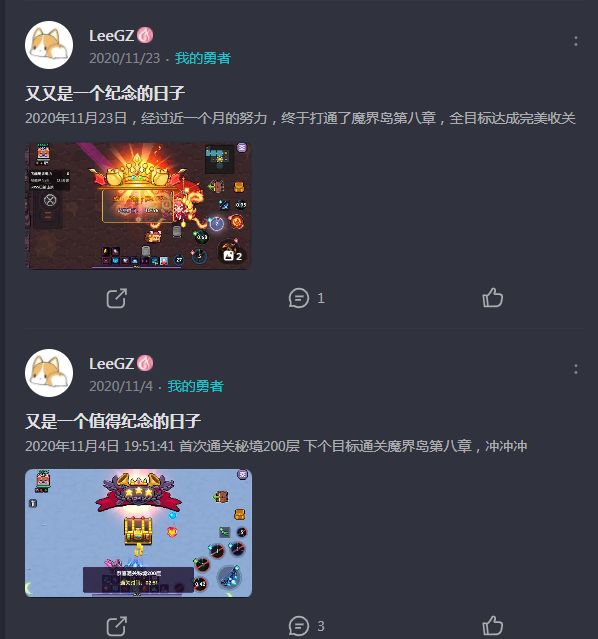 2、通关记录魔界岛版本,2020年11月4日秘境通关200层,2020年11月23日魔界岛通关第八章。熟悉老版本的玩家应该知道以前通关秘境200层并不是简单的事情,与目前通关小秘境240关难度完全无法相比较。