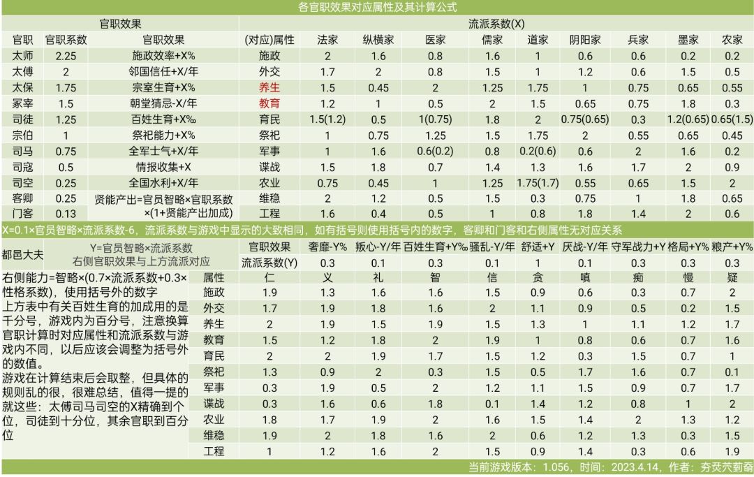 顺带把能力和效果的计算给统计了一下,括号内数字为测试出来的实际数值,红字的两个属性表示和游戏里给的官职对应属性不同,已反馈给官方。