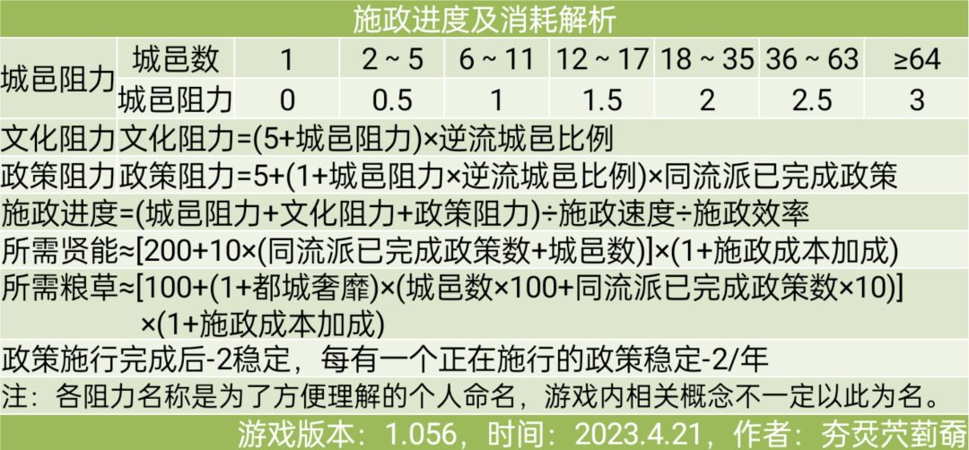 政策阻力=5+(1+城邑阻力×逆流城邑比例)×同流派已完成政策。