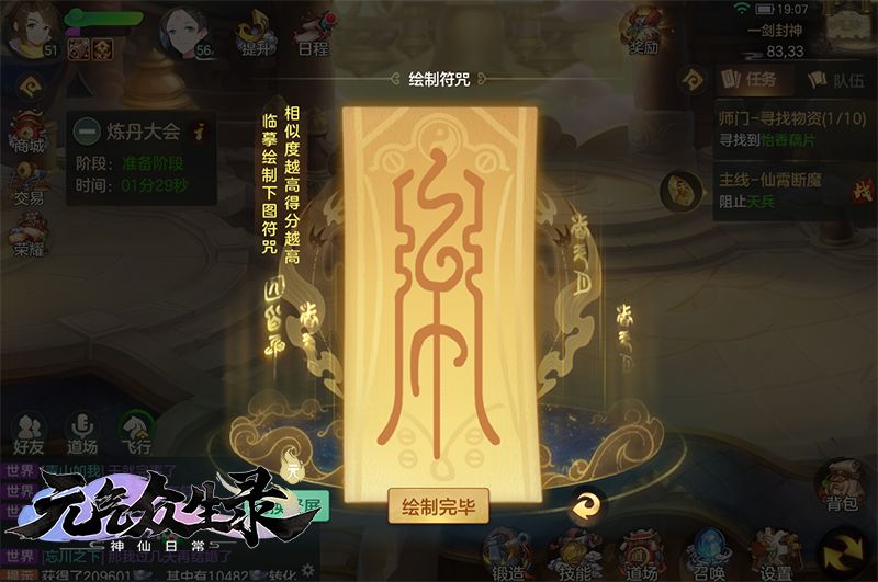 炼丹阶段时长4分钟,在这期间上仙们要抓紧到炼丹炉里,拿着我们刚刚画好的和道场赠送的一共5张符咒炼丹。需要上仙们注意的是,这五张符咒里只有两张可以炼给自己,其他的必须用来帮助道场里的其他上仙,所以请上仙们务必分配好自己手中的符咒。