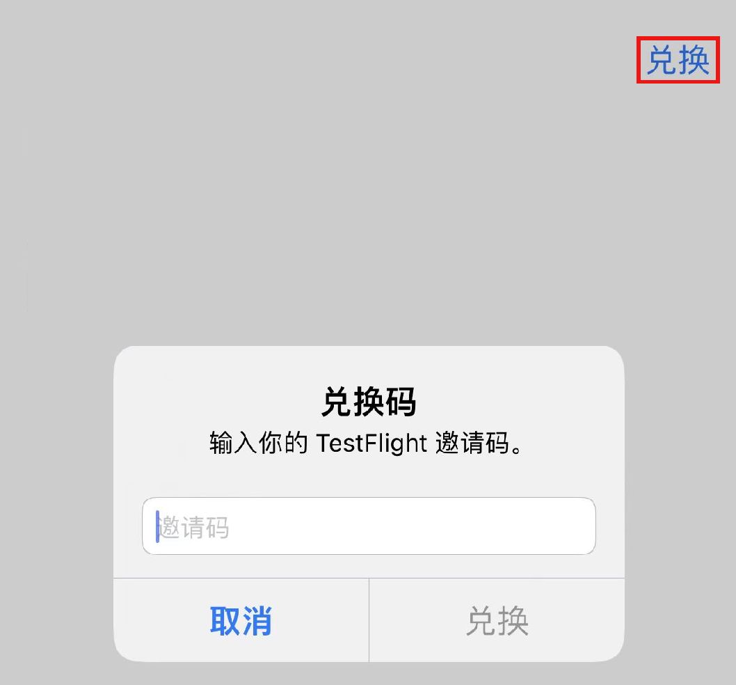 2、打开TestFlight APP,点击右上角的“兑换”按钮,在弹出的输入框中输入来自TestFlight邮件中的邀请码,点击兑换后即可自动开启下载安装。