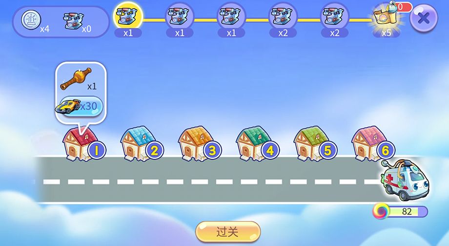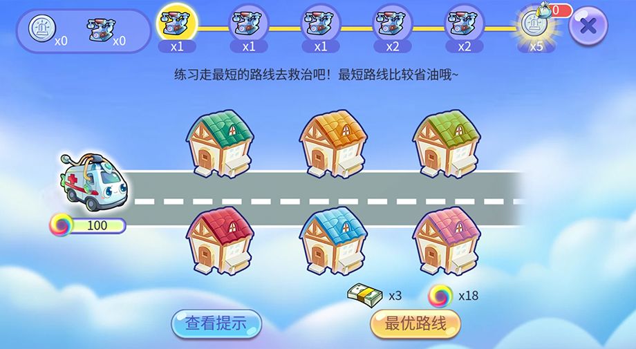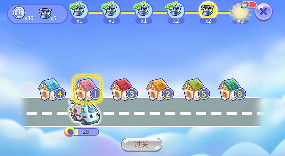 救护车会根据大家选好的路线依次救助患者,如果按照编号排列正确,那么救护车将最省油(救护车下方会显示剩余油量的进度条)。