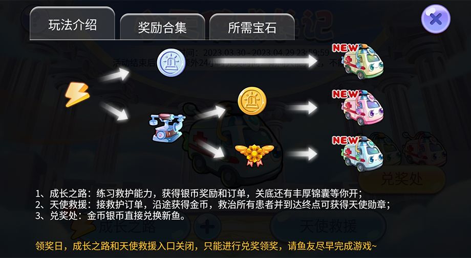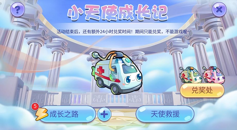 在完成<成长之路 >后,进入右侧的<天使救援>来提升救护车的救治能力,获取金币就可以到兑奖处兑换新鱼奖励啦~