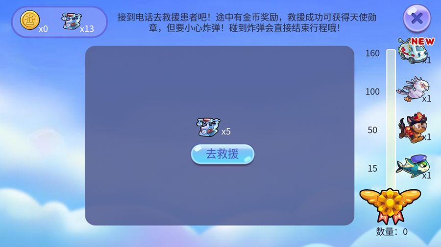 点击去救援后,开始救援挑战,翻开云朵、找出患者即可完成救治并获得金币,达到勋章位置即可过关并获得天使勋章,累积勋章可兑换鱼儿奖励~