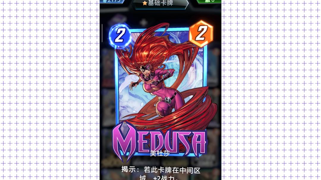 该我们的美杜莎上场了!这张牌如果放在中间的区域,那么战斗力就会加2,另外一定要注意卡片左上角还有一个数值,这是放置卡片需要消耗的能量点,屏幕下方有个球,这个球上的数值就是我们可以消耗的能量点,所以这里引出一个规律:需要更多能量点的卡片往往更加强大!