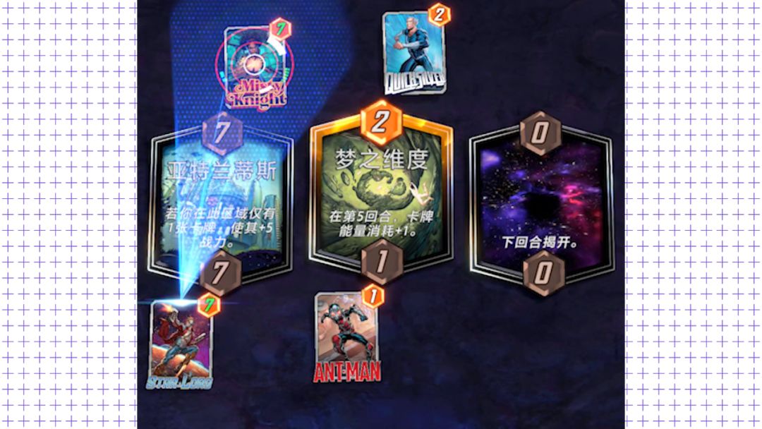 卡片上有效果,区域上也有效果,所以我们要利用不同英雄的特殊能力赢下比赛,值得一提的是,很多卡片还有很棒的特效,像是这张星爵,拖放的时候有尾焰效果,而且他的特殊能力是扫描对面,如果对手在这个回合放了卡片在这个区域,那么星爵就会提升3点战斗力,很棒的卡片对吧!
