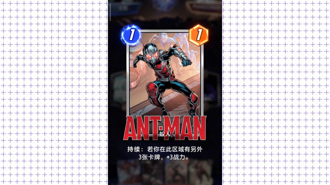 来到最后一回合,我使用钢铁侠上场!钢铁侠可以让这个区域内的战力翻倍,在加上我最先放置的蚁人,蚁人的效果是:当区域还有3张卡,那么他的战斗力加3,所以优势在我!