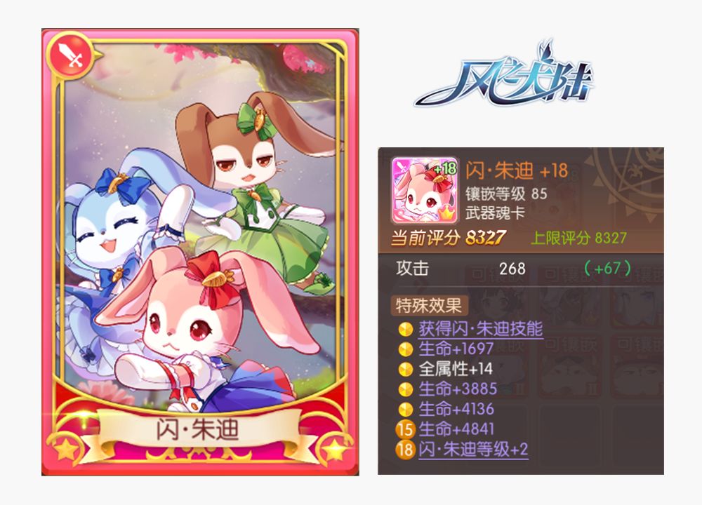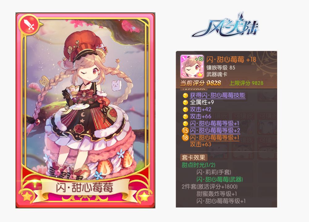 其随机附加闪·甜心莓莓等级、攻击、智力、体力、全属性等特殊效果,与“闪·莉莉”组合还可以激活套卡效果。