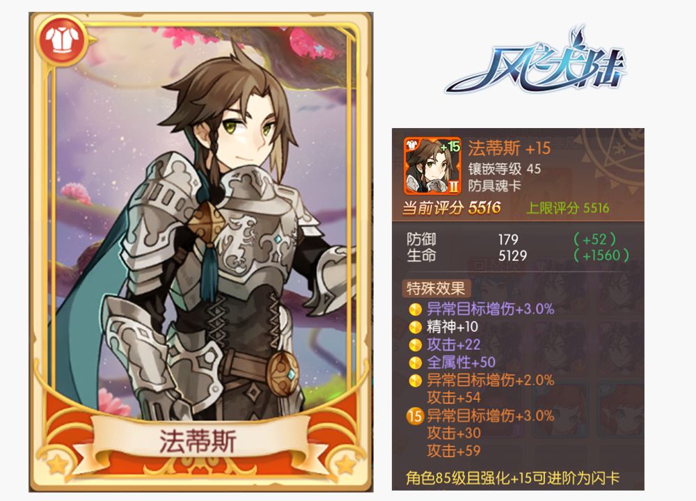 像戴斯特、法蒂斯这样帅气的魂卡,都可以在角色 达到85级且强化至+15后,进阶为闪卡。