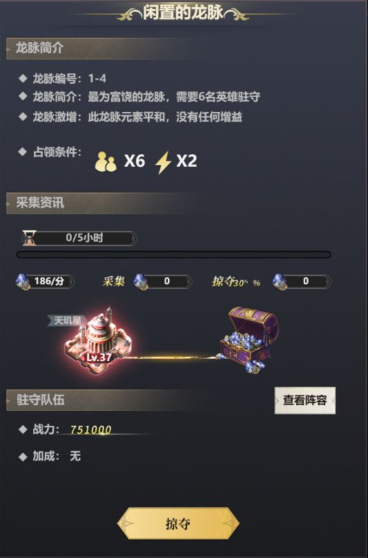 4.占领龙脉后,可以消耗指定道具,为龙脉附加加成效果,包括产出效率提升,驻守英雄属性提升等同时最多驻守6个龙脉。