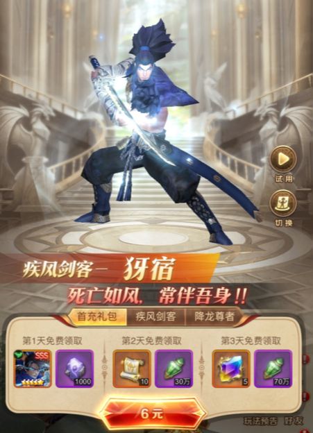 充值6元,立刻获得sss同伴-游侠剑客,前期高爆发高伤害给力同伴!更能连续3天领取豪华大礼~