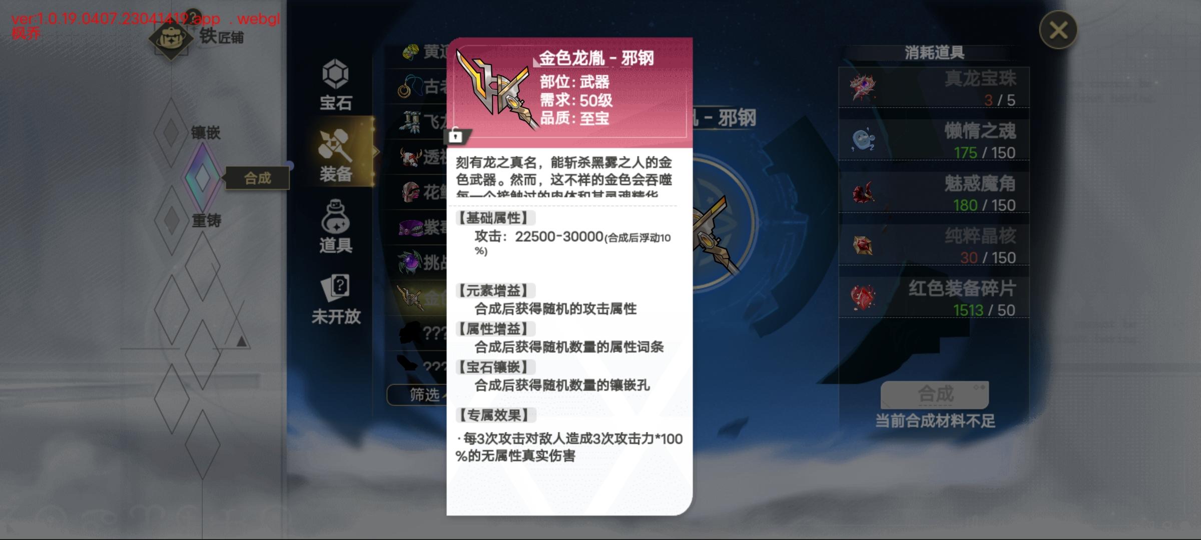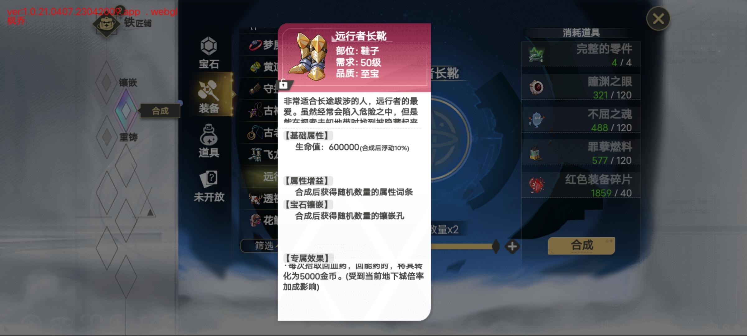 本来是没这一栏的,但是有一件铁匠铺合成的装备真的很不错所以我加了进来(有附图)远行鞋,效果是捡的回血药回能药变成金币,这个真的是打金神器了