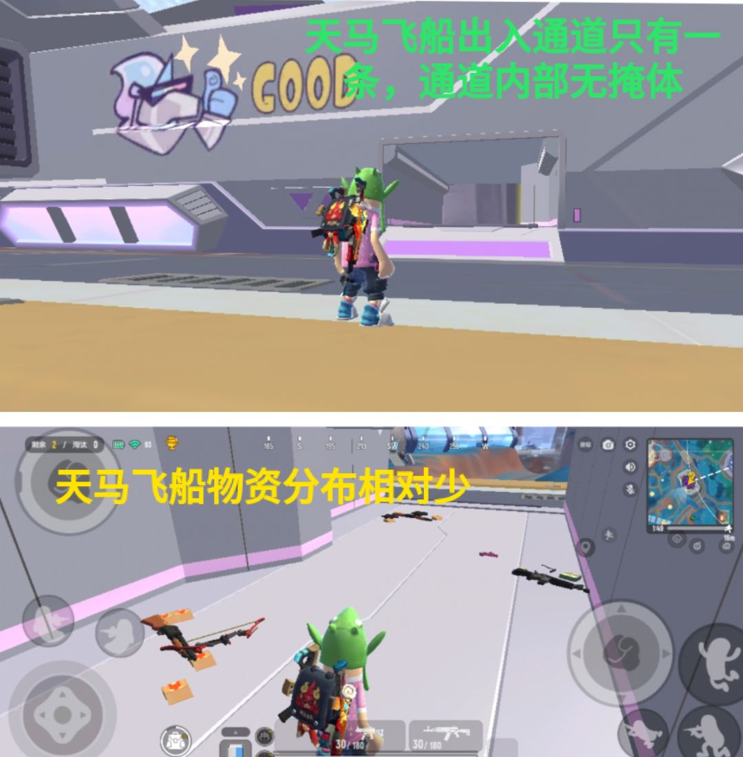 别看天马飞船体积长,其实出入通道只有一条,且内部通道物资极少不推荐落点选择。