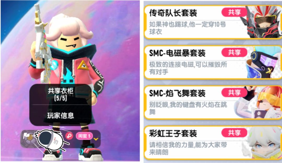 4级:亲密度到达3000时组队可以共享对方衣服,可以体验限定皮肤哦!(好友有老玩家套装,可以体验哦)每周有5次共享机会。