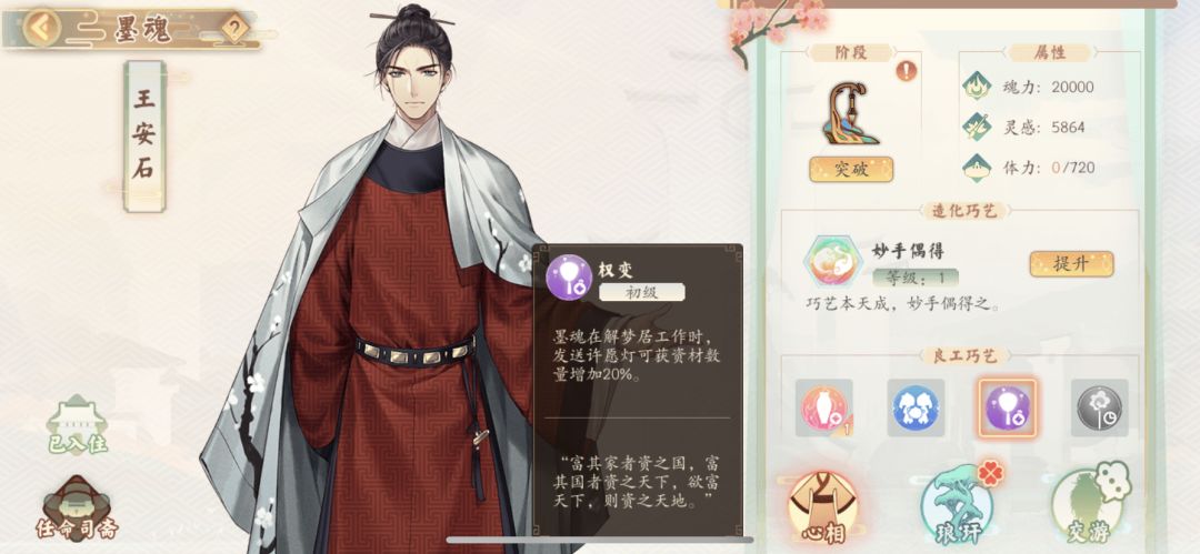 先推荐一个墨魂,开局四选一的王安石,jeff。推荐的原因是2阶段的介甫会多一个技能“权变”可以增加许愿20%的资材获取。资材现在真的是我非常稀缺的物资了,庄生梦魂快1K了,资材每天都用光。