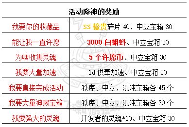 活动期间,触发降神时,概率触发活动限定的降神,玩家可向活动降神提出一些愿望,根据愿望不同获得不同奖励每次活动,最多触发3次活动降神。