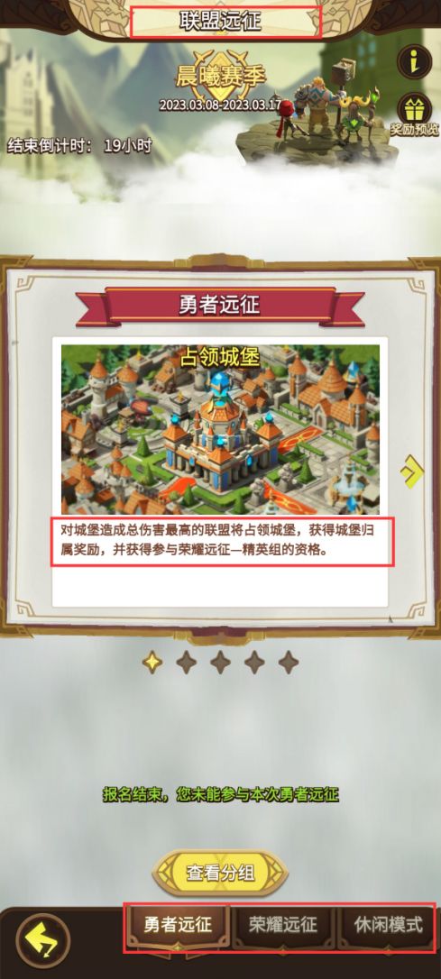 错过报名的玩家也不用担心,可以在【联盟远征-休闲模式】中和其他人组成临时联盟参与进去,但是临时联盟无法上排行榜和争夺城堡。