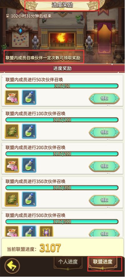在比如伙伴召唤这样的运营活动中,玩家可以累计自己的“个人进度”条,获得进度奖励,还可以领取联盟内成员召唤伙伴到一定次数的“联盟进度”奖励,活动材料等物品。