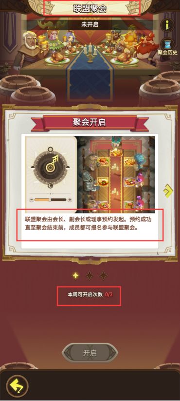 联盟会长、副会长或理事可以预约发起联盟聚餐,联盟内成员报名后即可参与联盟聚会,摆放的佳肴越丰盛,聚会档次越高,可获得的聚会奖励也越好。